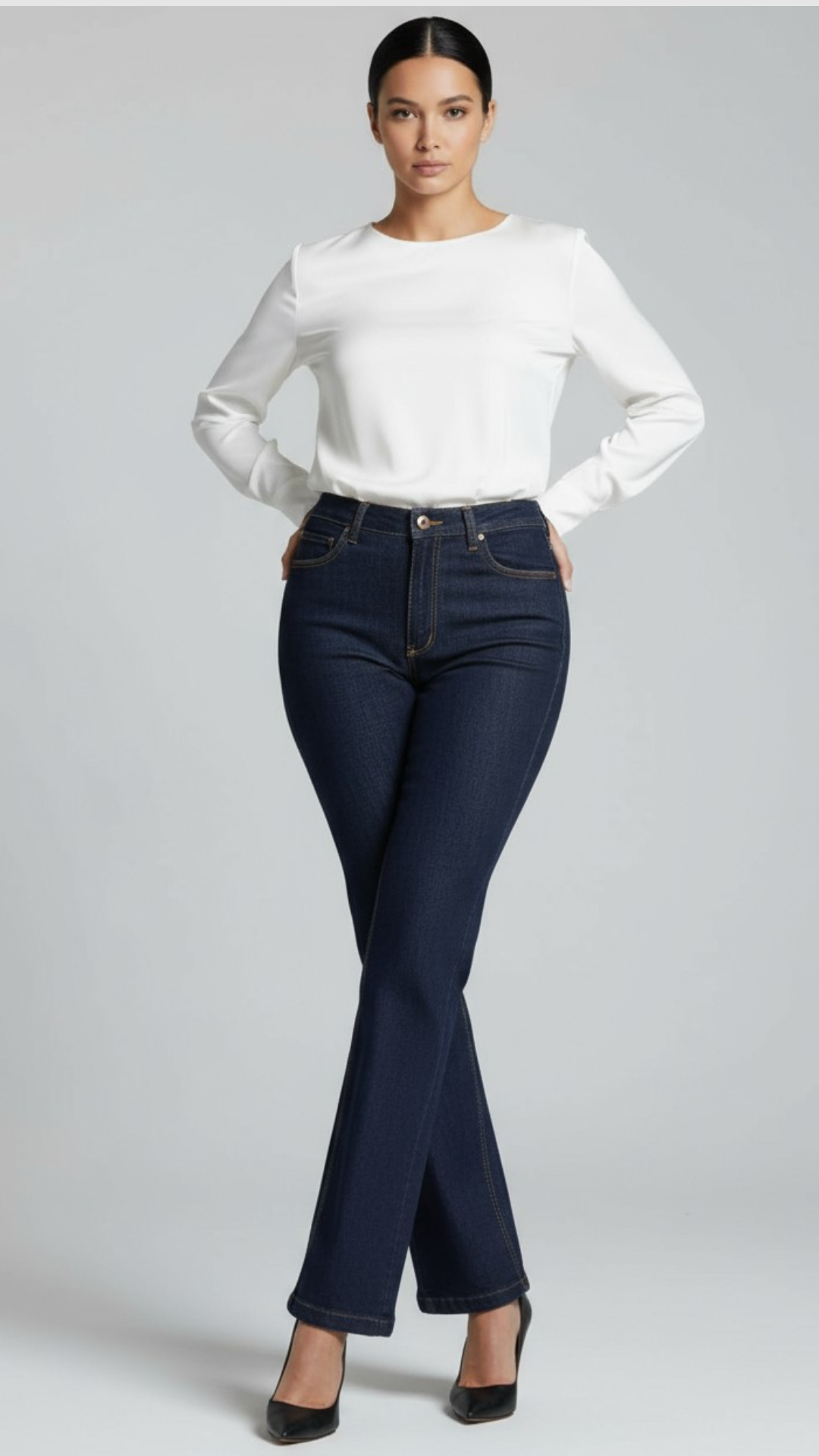 Choosing the right cut can enhance body shape and provide the perfect fit. For pear-shaped figures, bootcut or flare styles help balance wider hips while highlighting curves. These cuts create an elongated, well-proportioned look that flatters the lower body.