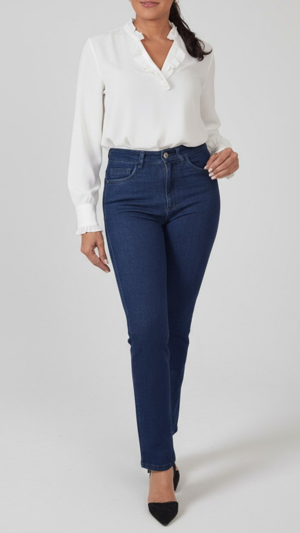The dark blue straight leg jeans are designed to be curve-friendly, offering a fit that flatters and enhances natural body shapes. With a high-rise waist and just the right amount of stretch, they hug the hips and waist comfortably without feeling restrictive. The straight-leg cut provides balance, creating a streamlined look that complements curves while maintaining a sleek silhouette. These jeans move with the body, ensuring both style and comfort, making them a great choice for those who want a figure-enhancing yet relaxed fit.