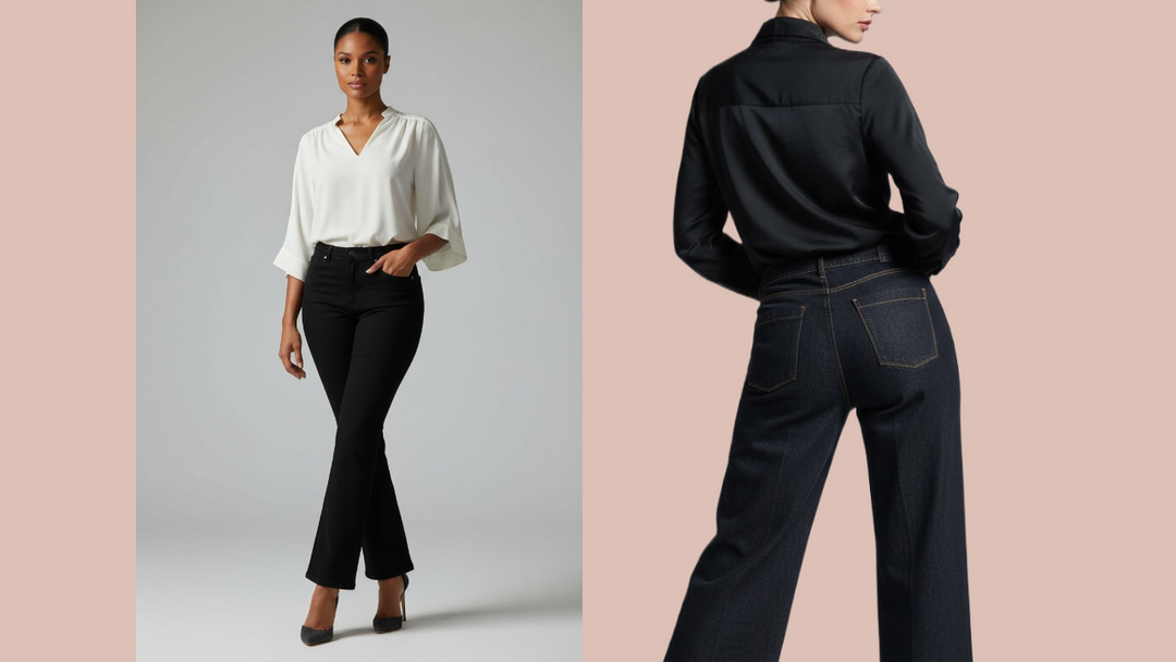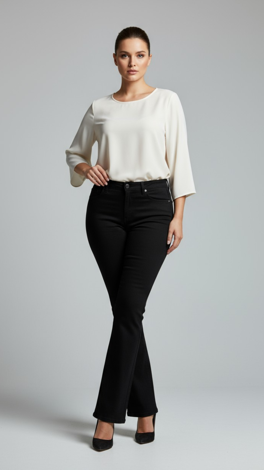 Choosing the right cut can enhance body shape and provide the perfect fit. For pear-shaped figures, bootcut or flare styles help balance wider hips while highlighting curves. These cuts create an elongated, well-proportioned look that flatters the lower body.