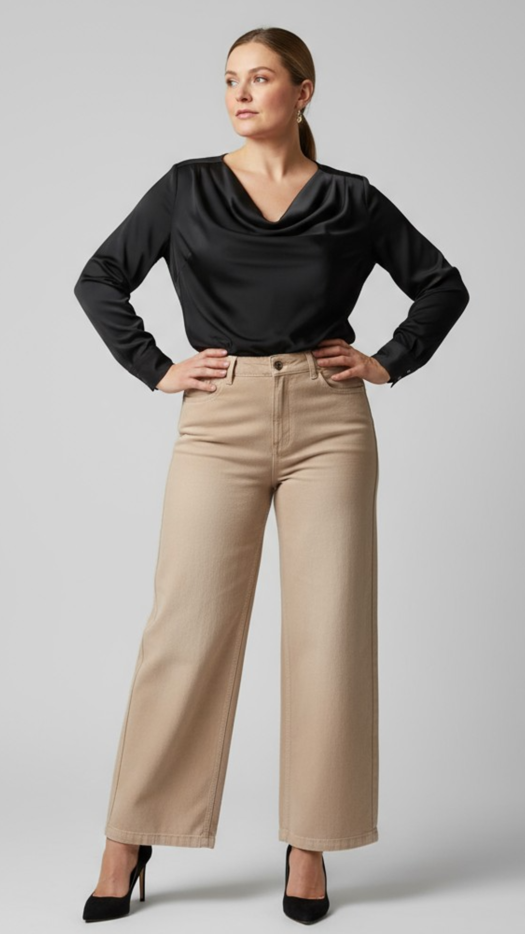 Hourglass figures look best in skinny or high-waisted straight-leg styles, which hug the waist and hips while maintaining a smooth and structured appearance. These styles enhance natural proportions for a polished and stylish fit.