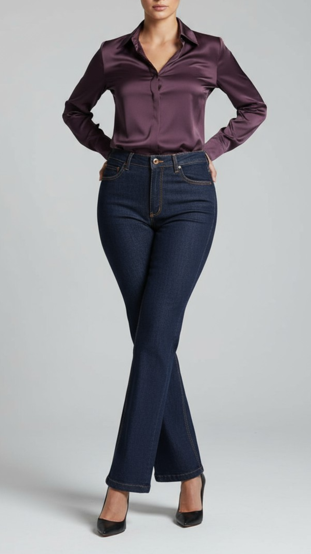 Choosing the right cut can enhance body shape and provide the perfect fit. For pear-shaped figures, bootcut or flare styles help balance wider hips while highlighting curves. These cuts create an elongated, well-proportioned look that flatters the lower body.
