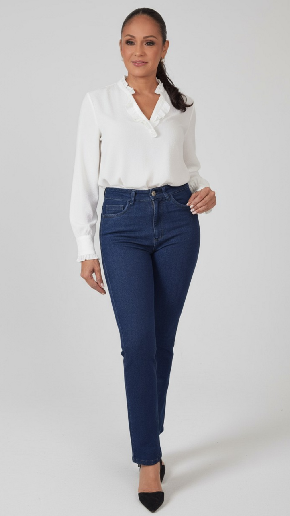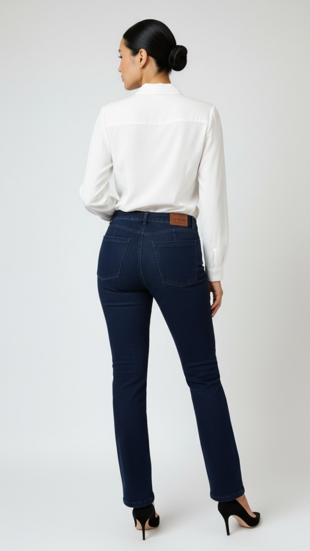 Casual Meets Chic: Elevate your look with these navy straight-leg jeans, featuring push-up technology and tummy control support. Made with scratch-resistant premium denim in Colombia, they bring a perfect blend of versatility and sophistication.